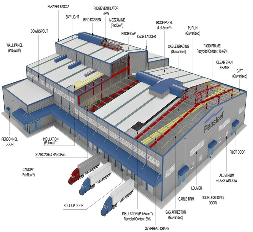 Pre-Engineered Building (PEB) is a metal building that consists of light gauge metal standing seam roof panels on steel purlins spanning between rigid frames with light gauge metal wall cladding